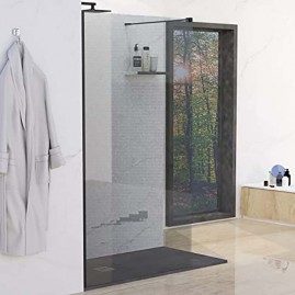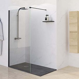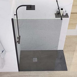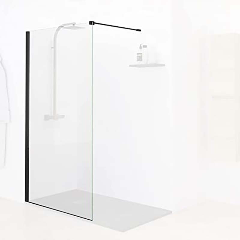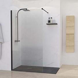 Mampara fija de ducha, en cristal templado transparente de 8 mm con Certificado de conformidad Europea. Anclaje a pared con perfil de aluminio lacado negro mate. La mampara tiene una altura de 195 cm. Mampara reversible para su colocación. Cristal con tratamiento anti cal. Fácil de limpiar. Cuenta con un embalaje de alta seguridad. Producto de fácil instalación.